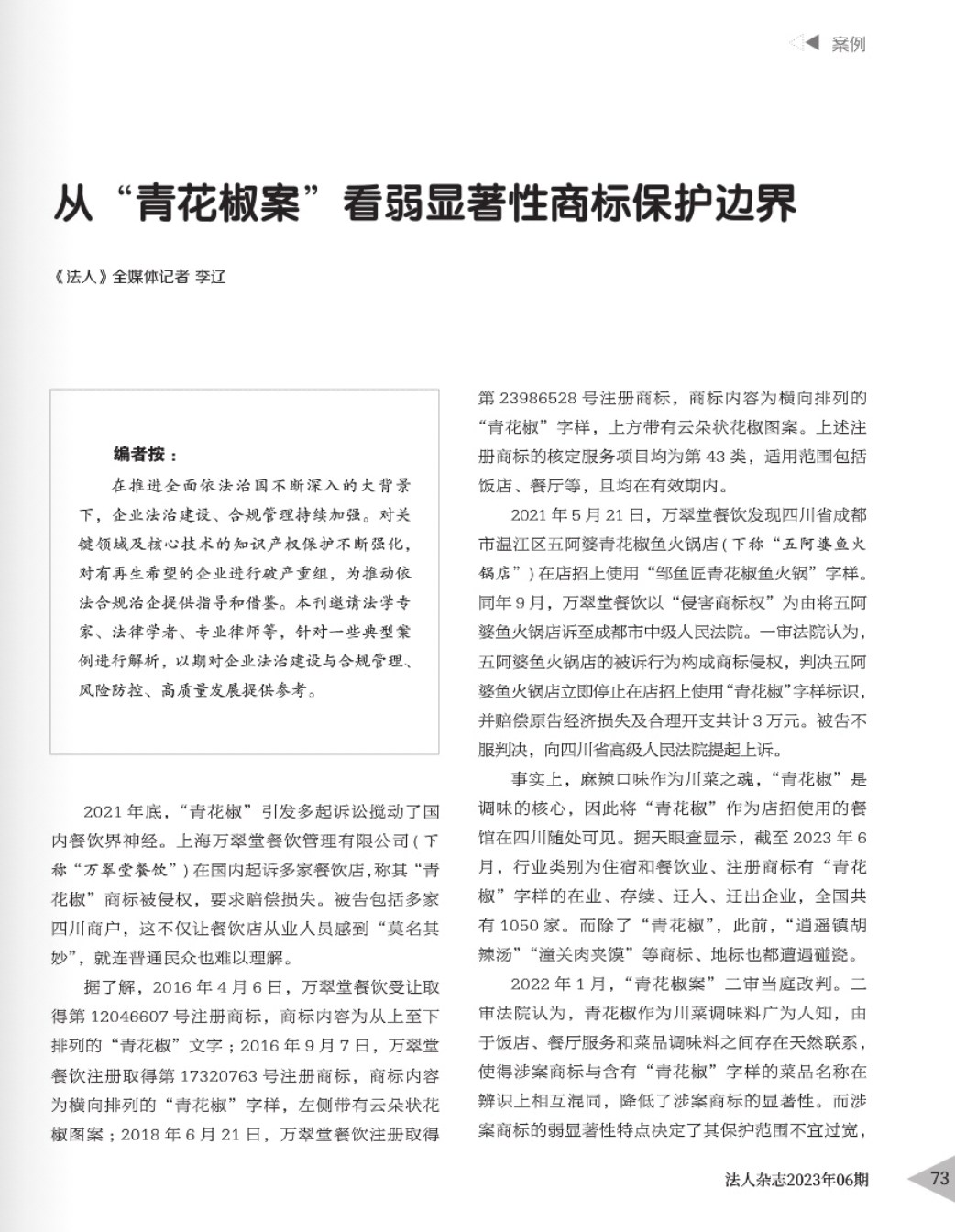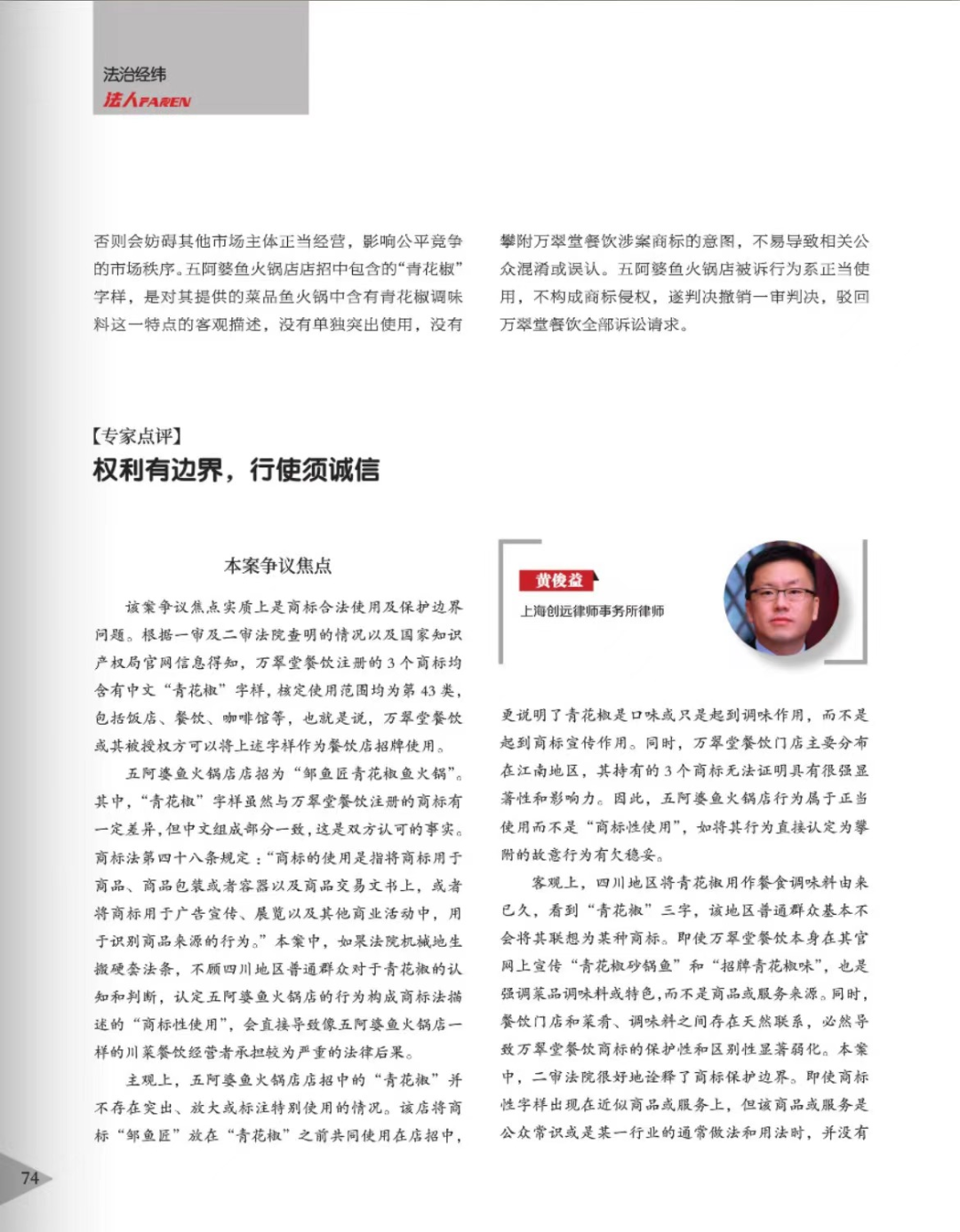 江西辉知简讯 | 辉知队黄俊益律师应“法治日报”旗下杂志邀请,就“青花椒”案发表专家点评