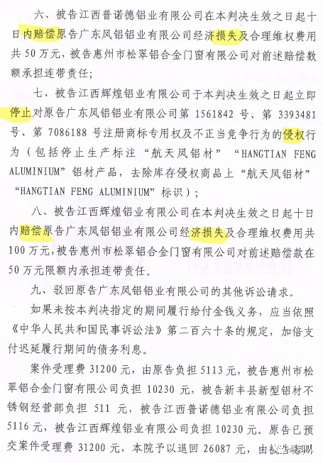 江西凤铝系列维权案:诉辉煌公司等四被告,法院判赔250余万